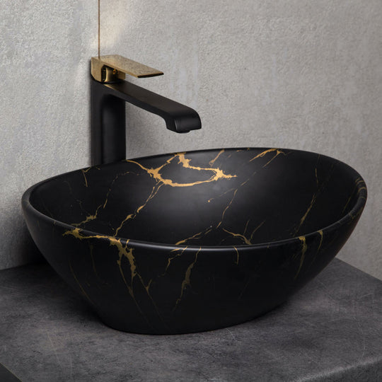Vasque à poser ovale en céramique TANDILA finition marbre noir doré