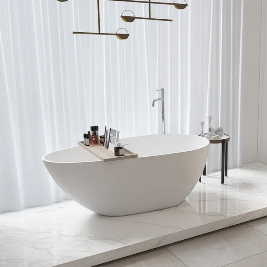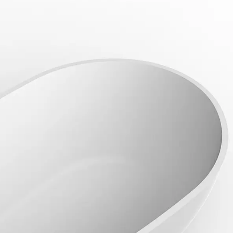 Baignoire îlot design en résine minérale solid surface de couleur blanche, finition mate. Vidage central et trop-plein. Finition haute qualité. Deux dimensions possibles : longueur 150 cm et 170 cm.