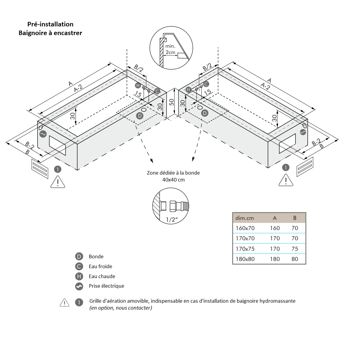 - Un tablier (non fourni) permet d'installer la baignoire contre un mur ou en îlot... Veuillez également nous contacter pour cette option.