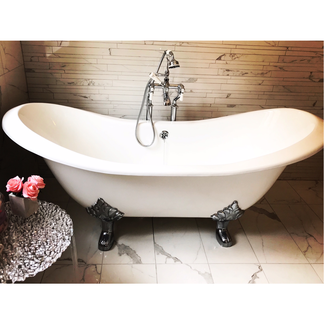 Baignoire rétro en fonte émaillée sur pieds pattes de lion.