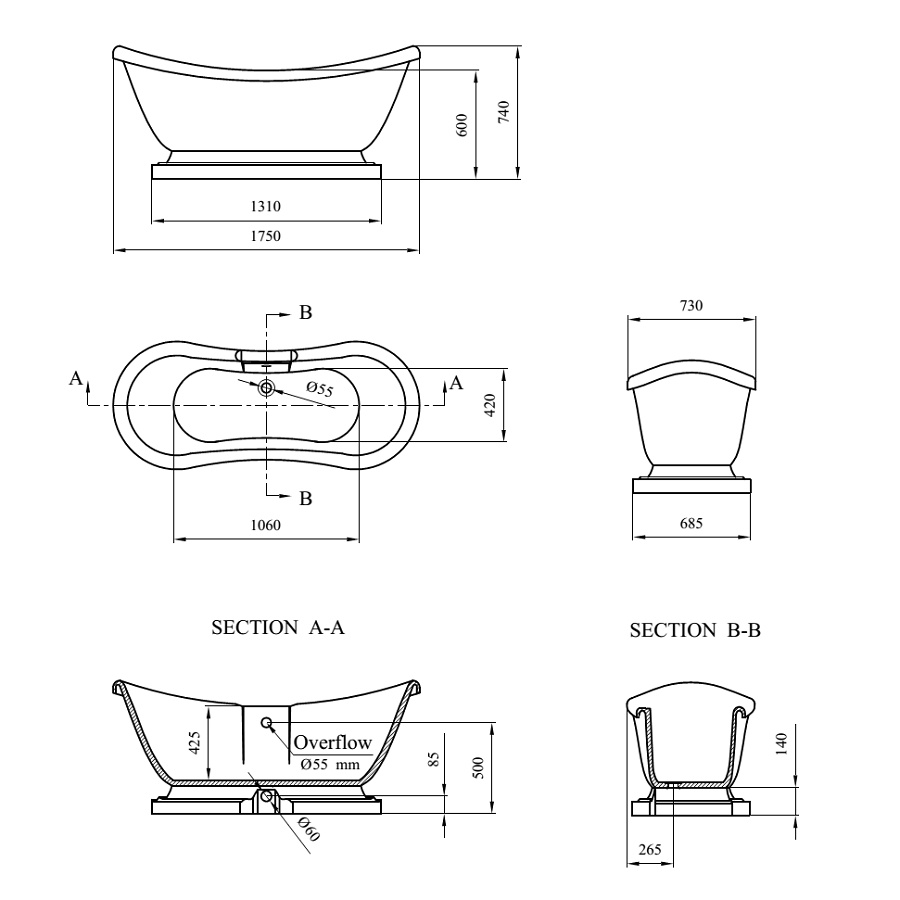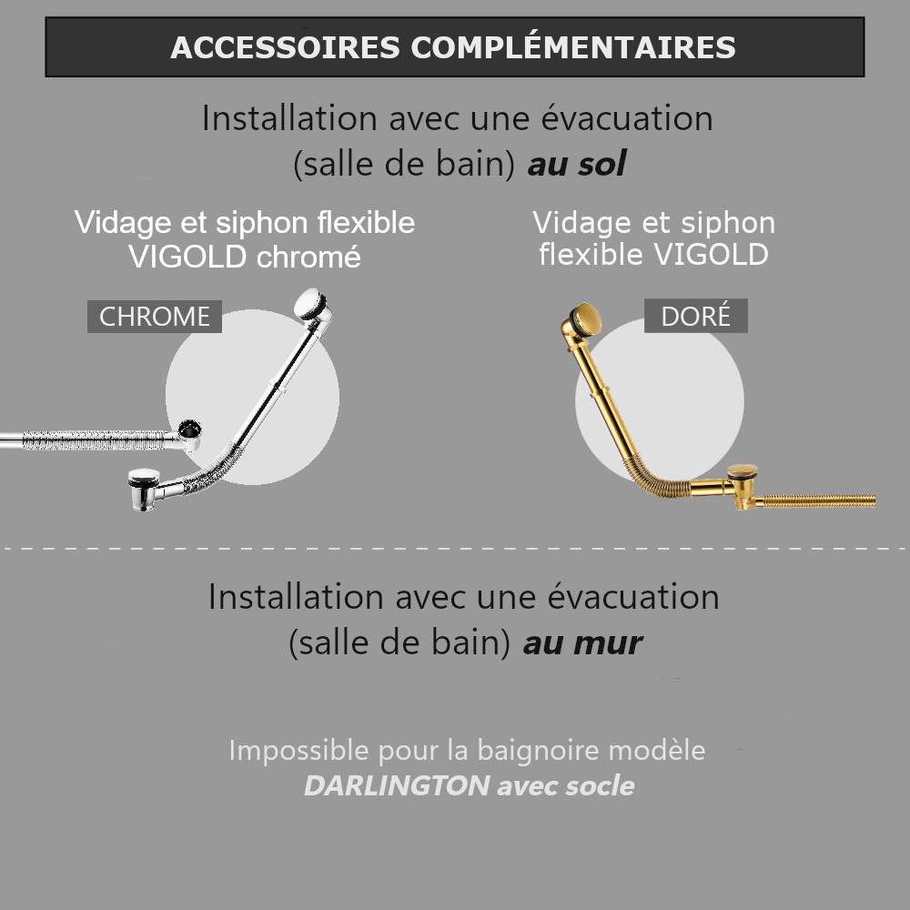 - Conditionnement : deux cartons, un pour la baignoire (Poids brut : 37 kg) et un pour le socle (Poids brut : 14 kg).