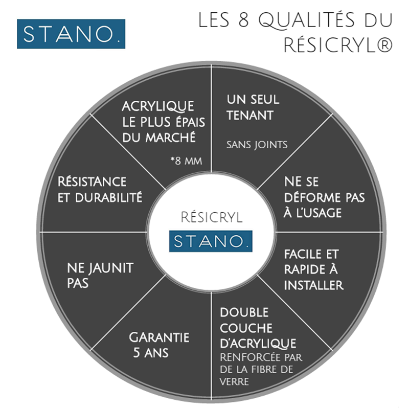 Paroi de la baignoire : deux plaques Résicryl®, une interne et une externe, scellées ensemble avec un renforcement en fibre de verre très résistant, épaisseur totale du rebord : entre 1 et 2 cm suivant les endroits, en fonction du besoin de résistance à la charge et aux pressions.