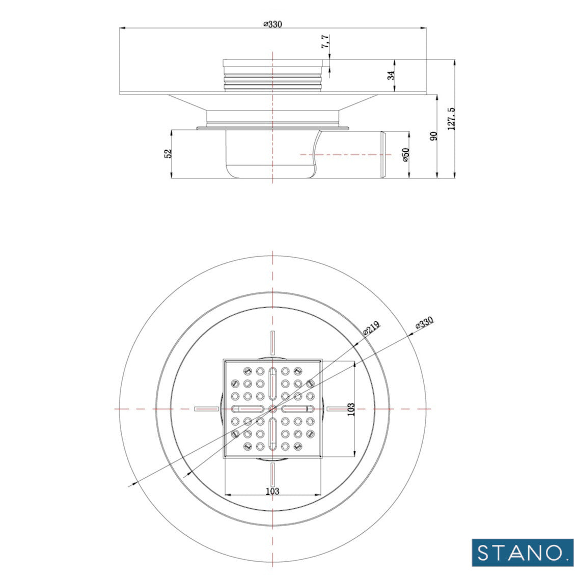 Grille carrée : 10,7 x 10,7 cm. La hauteur de la grille est ajustable en fonction de la hauteur du carrelage.