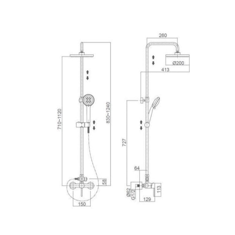 Colonne de douche réglable pour adapter la hauteur globale (70-110 cm), en acier inoxydable.