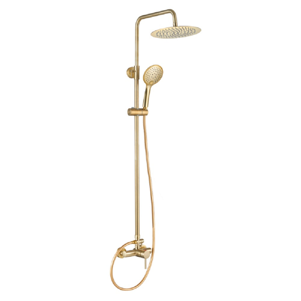 Ensemble de douche mural avec mitigeur mécanique. De style design rond, finition doré or, ce robinet comprend :
