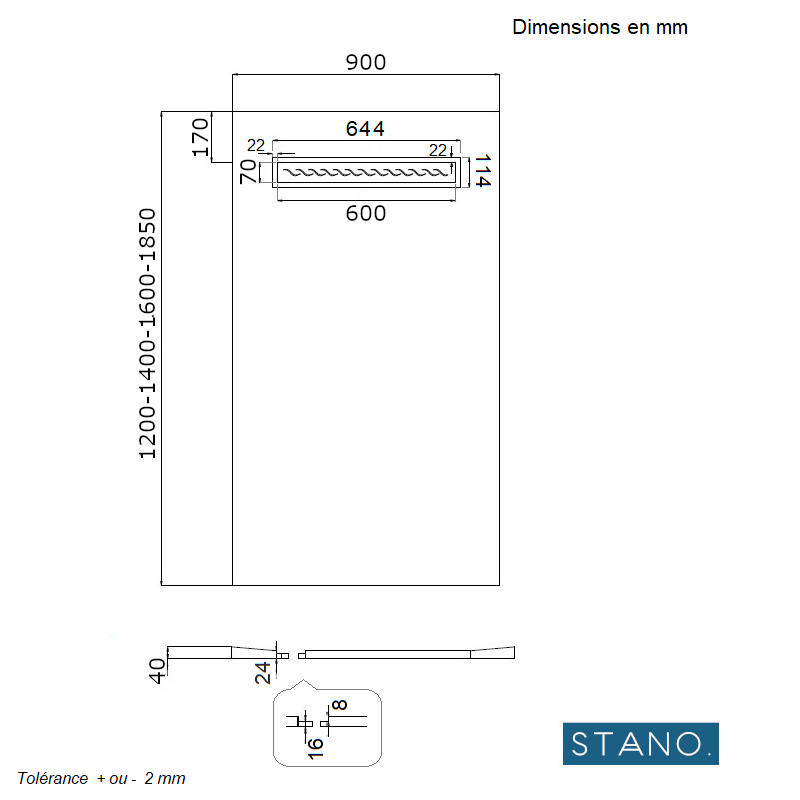 Pour l'étanchéité, le modèle en 90 x 185 cm dispose d'une natte d'étanchéité. Pour les autres dimensions, nous vous recommandons d'utiliser en périphérie une bande étanche pour permettre une bonne jonction et une étanchéité parfaite.