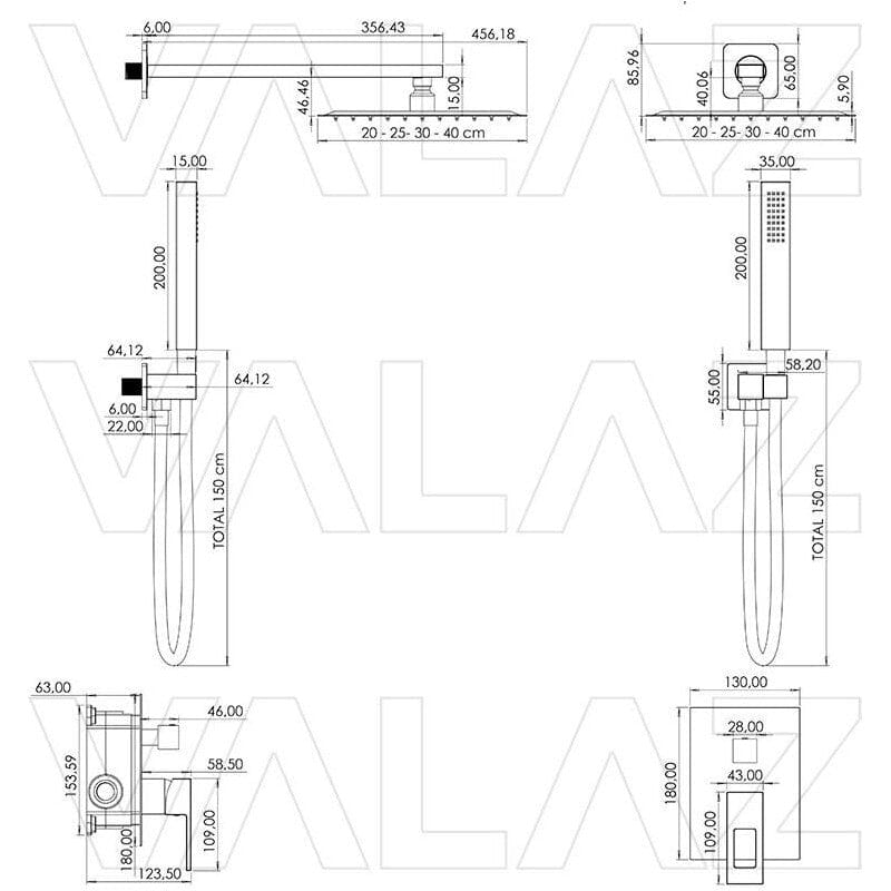- Colonne de douche équipée d’une tête de douche grand format, disponible en trois dimensions :