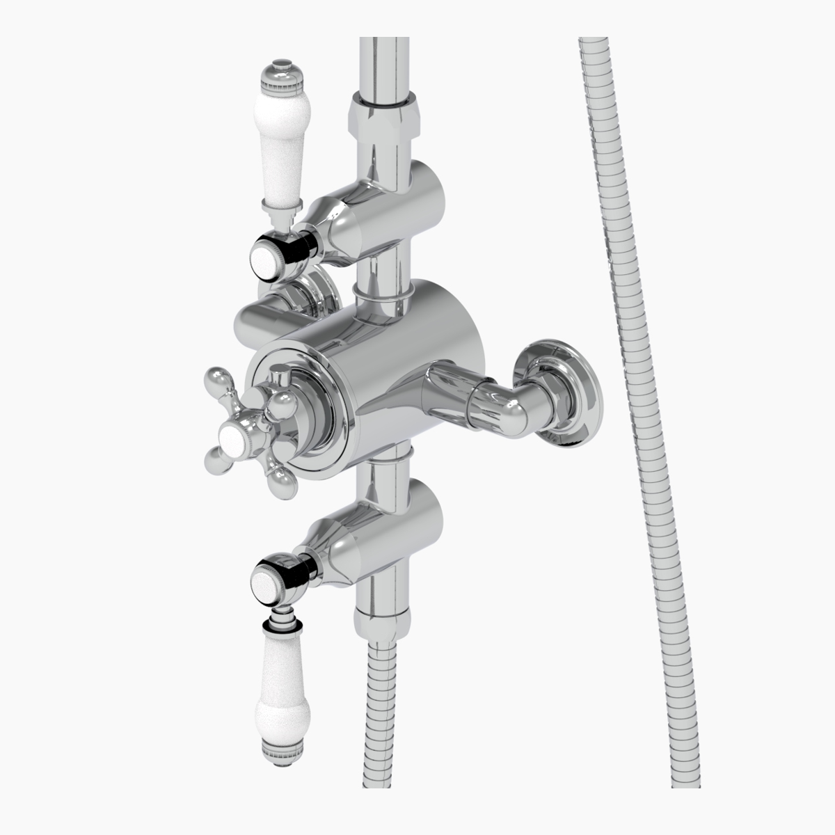 - Un robinet mitigeur thermostatique bain/douche mural avec manettes en céramique (robinets d'arrêt), de style ancien.