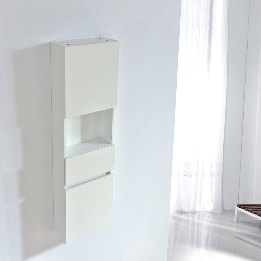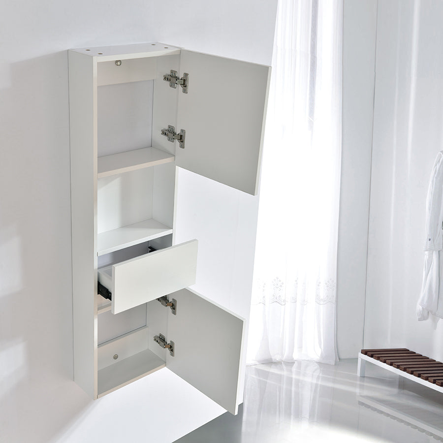 Cette armoire-colonne suspendue de grande dimension offre trois espaces intérieurs, grâce à deux grandes portes et un tiroir, ainsi qu'un compartiment extérieur.