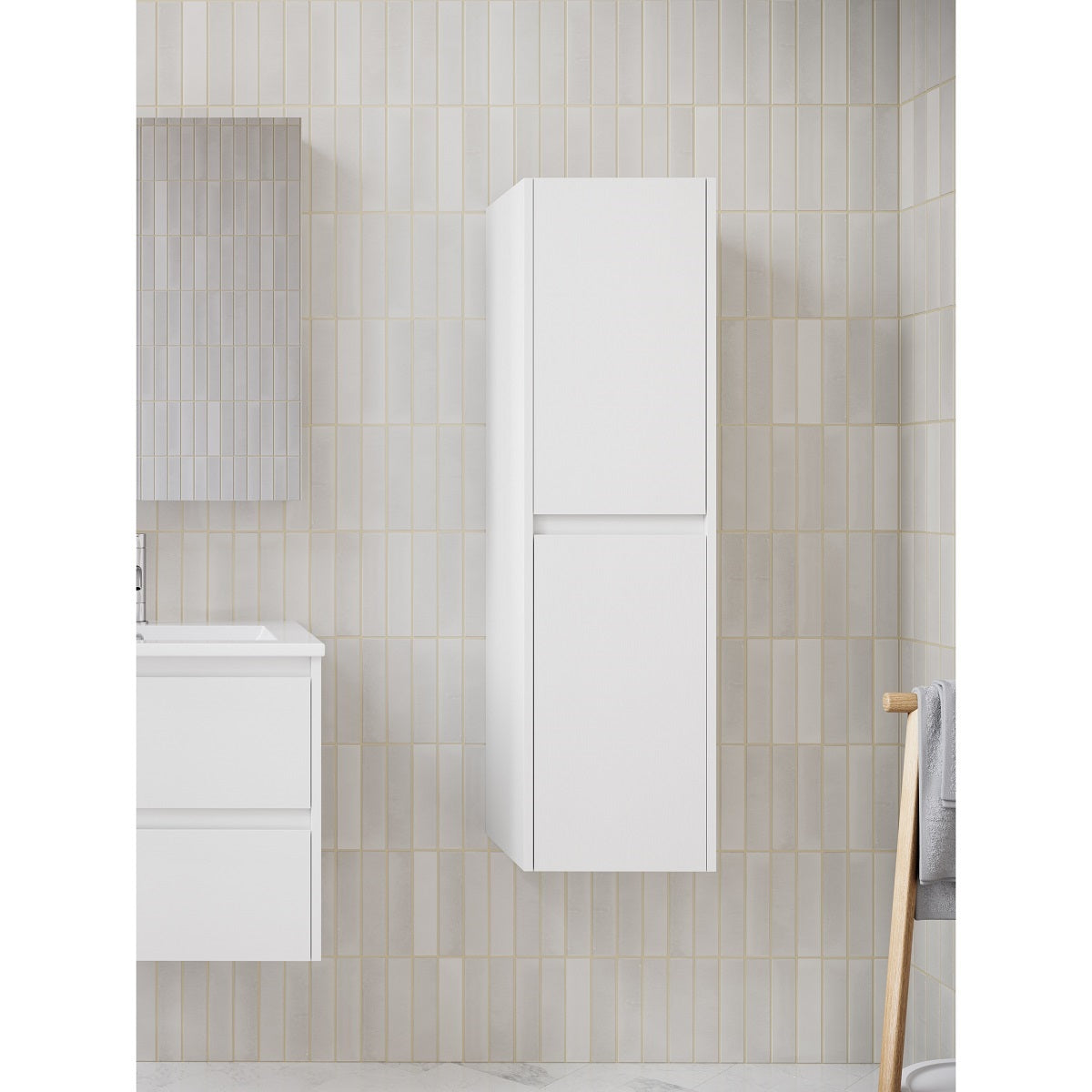 Utilisez de la hauteur pour ranger vos affaires de salle de bain et libérer de l'espace grâce à cette grande armoire de rangement au design moderne et minimaliste. Meuble en kit à monter soi-même.