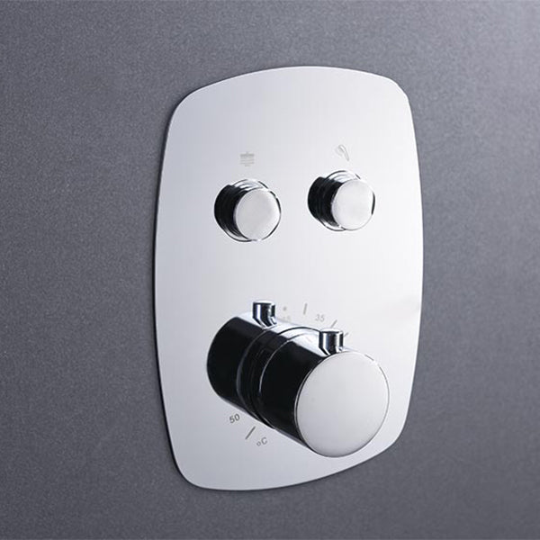 Un robinet thermostatique 2 voies encastré en laiton chromé, avec distributeur à bouton poussoir en laiton chromé;