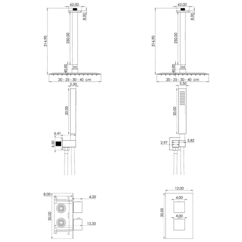 Une tête de douche en acier inoxydable, carrée de côté 30 cm, extra-plat et anti-calcaire ; elle est à encastrer à ras du plafond ;