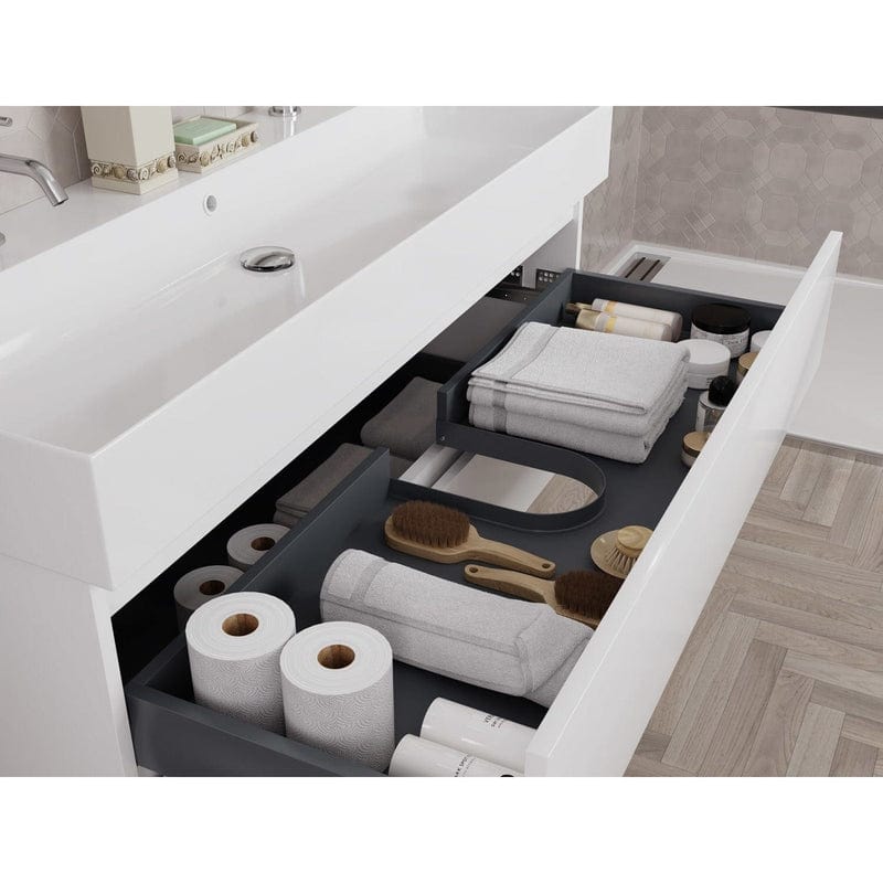 - 1 tiroir métallique avec fermeture amortie (Softclose) et découpes pour siphon