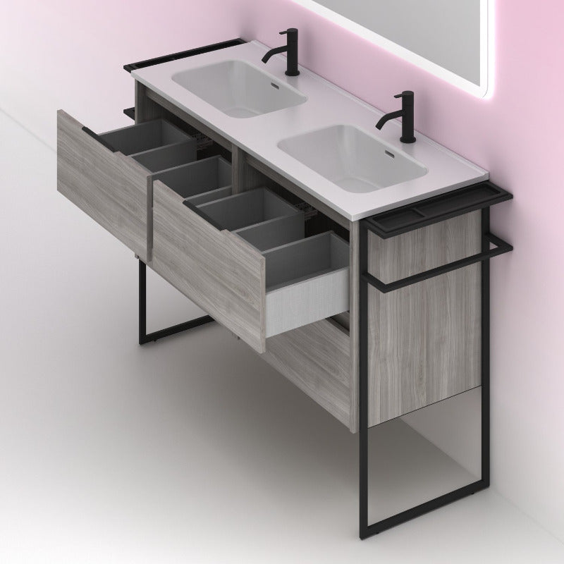 Meuble de salle de bain double vasque en bois de coloris gris sablé, sur pieds en métal noir.