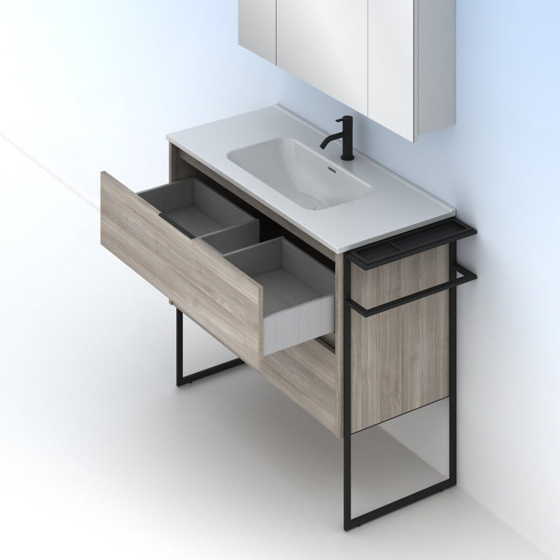 Meuble de salle de bain en bois de coloris gris clair sablé, sur pieds en métal noir.