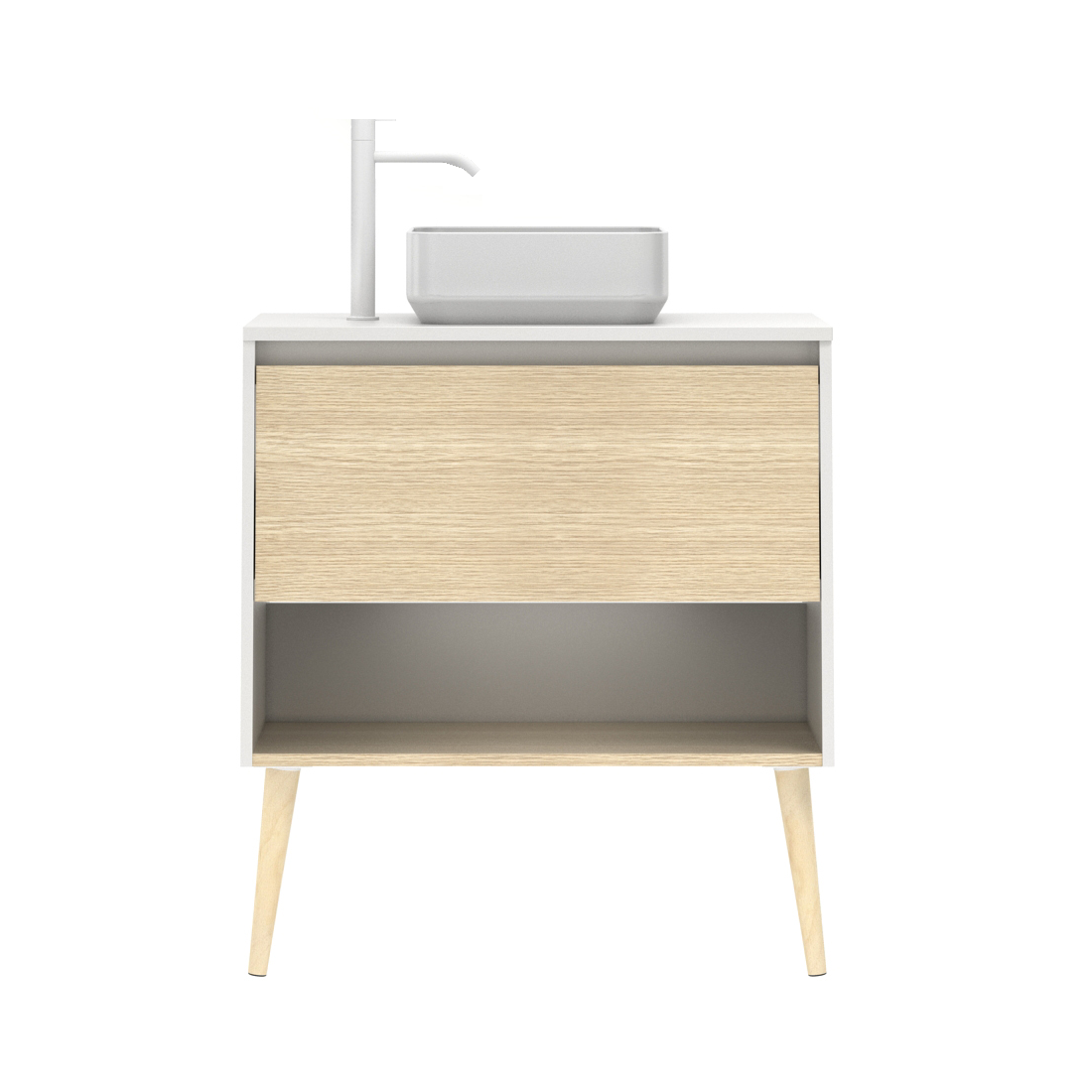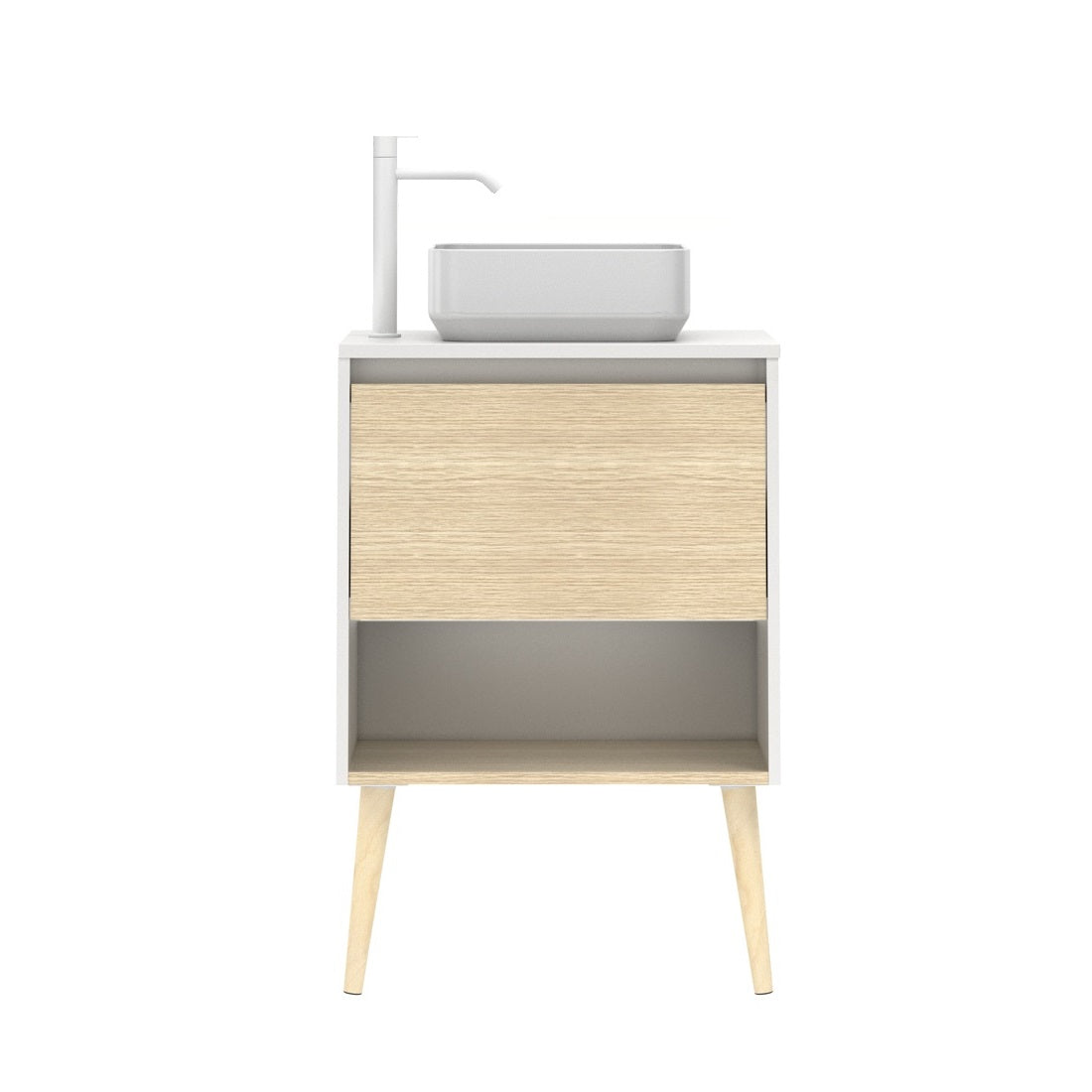 Meuble de salle de bain en bois sur pieds, de coloris chêne clair et blanc, vasque posée incluse.