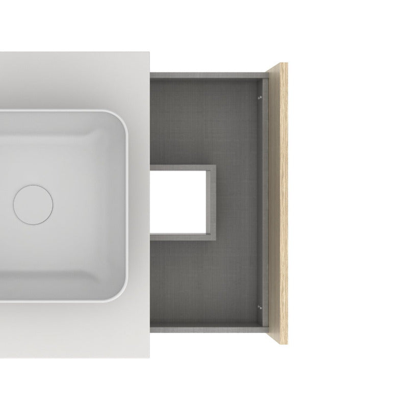 Finition blanche laquée sur les côtés et mélaminée chêne clair de face