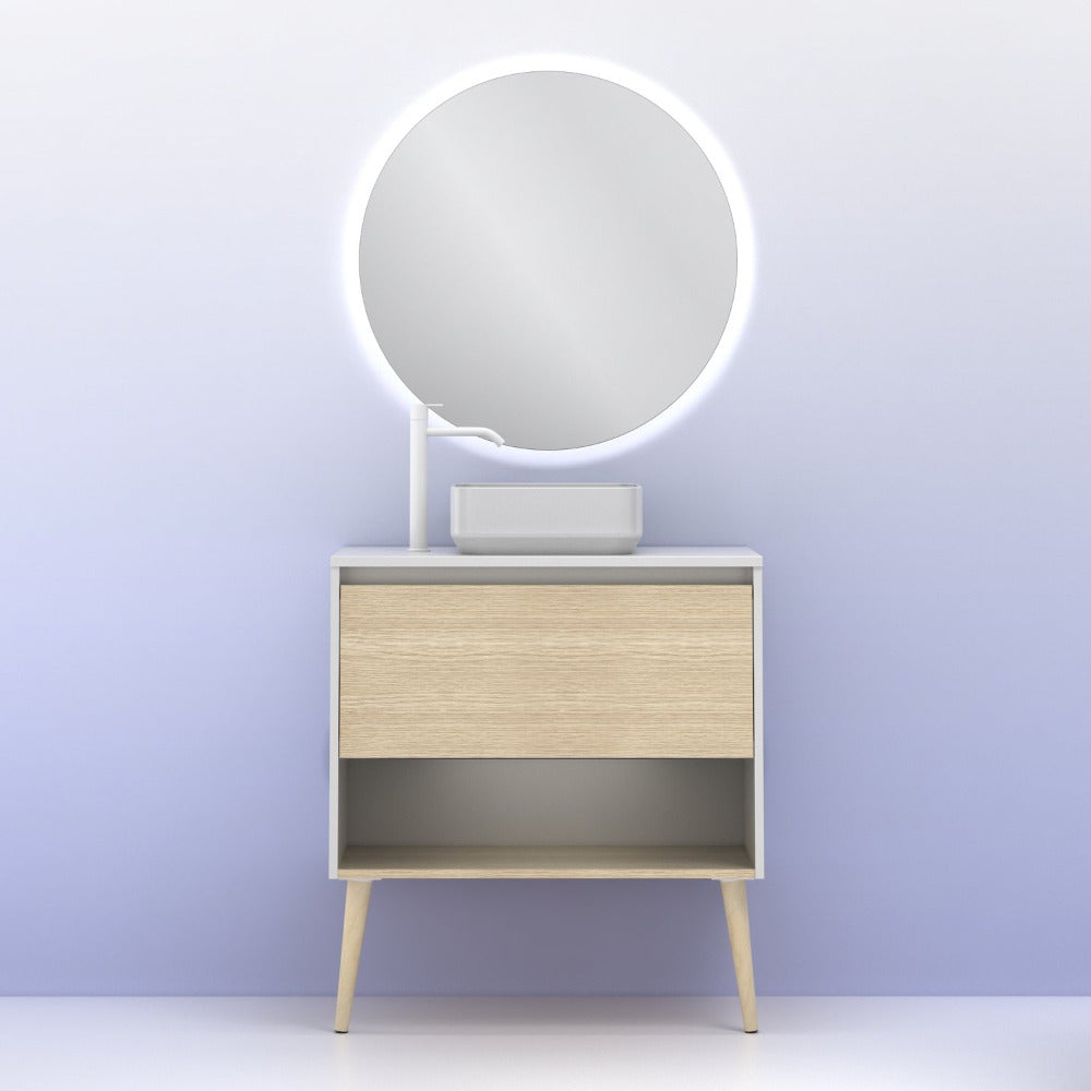 - Miroir NOZOMI rond avec lumière intégrée, pour le meuble de largeur 80 cm. Il comprend un verre poli circulaire incorporant une bande de LED illuminant l'arrière du miroir. Dimensions : 75 de diamètre et 2,5 cm de profondeur.