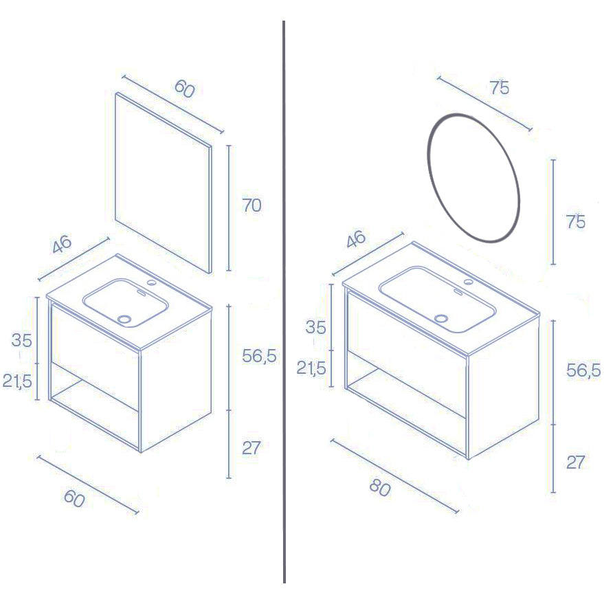 - Miroir NOZOMI rond avec lumière intégrée, pour le meuble de largeur 80 cm. Il comprend un verre poli circulaire incorporant une bande de LED illuminant l'arrière du miroir. Dimensions : 75 cm de diamètre et 2,5 cm de profondeur.