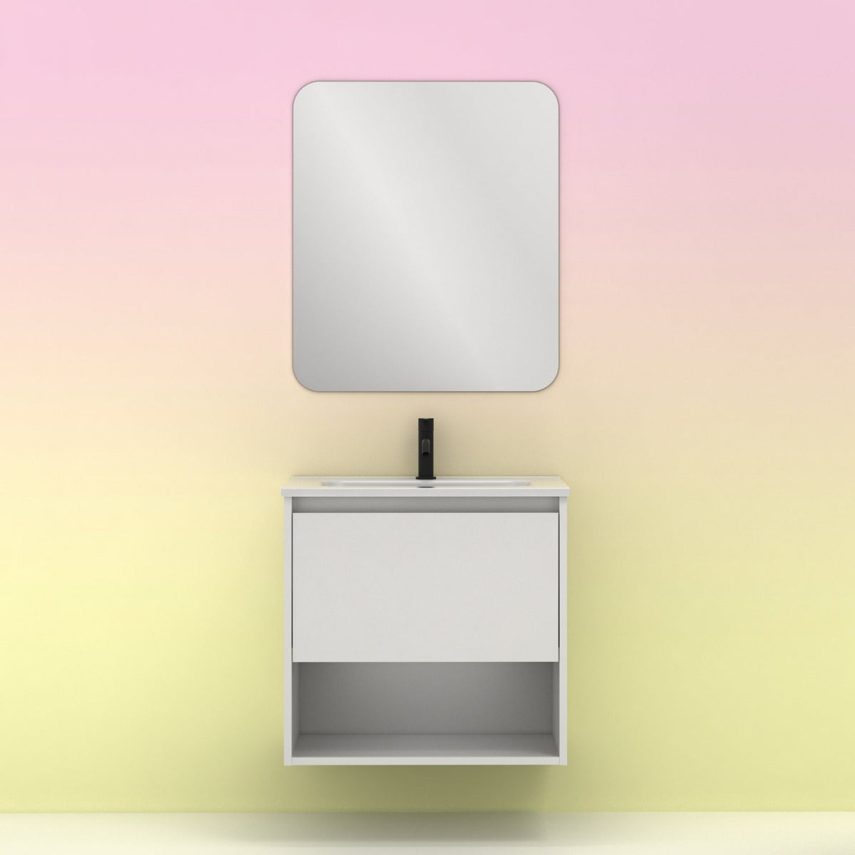 - Miroir SORA rectangulaire au design minimaliste, pour le meuble de largeur 60 cm. Il se distingue par son élégance, des bords arrondis, un verre poli et un emplacement pour un transformateur creux. Dimensions : largeur 60 cm x hauteur 70 cm x profondeur 2 cm.