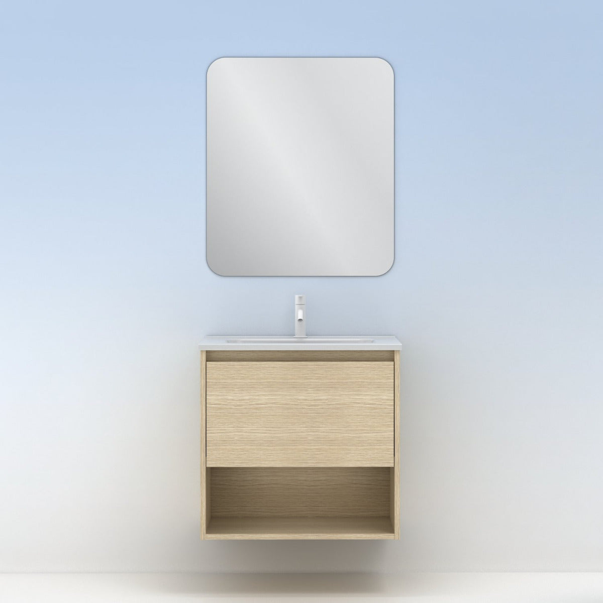 - Miroir SORA rectangulaire au design minimaliste, pour le meuble de largeur 60 cm. Il se distingue par son élégance, des bords arrondis, un verre poli et un emplacement pour un transformateur creux. Dimensions : largeur 60 cm x hauteur 70 cm x profondeur 2 cm.