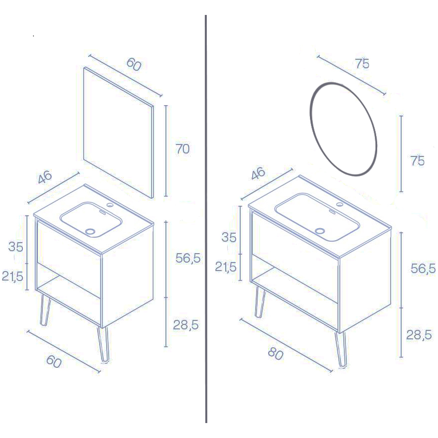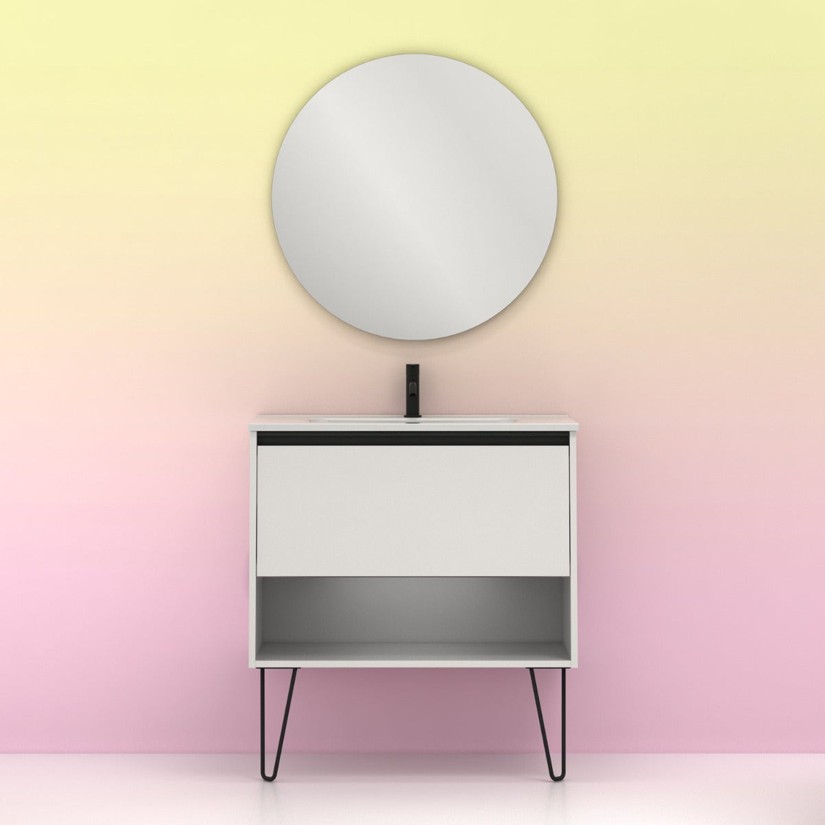 - Miroir MIKU circulaire pour le meuble de largeur 80 cm. Il se distingue par la simplicité de ses lignes design et comprend un verre poli de 4 mm collé sur un panneau de particules aggloméré gris. Dimensions 75 cm de diamètre x 2 cm de profondeur.