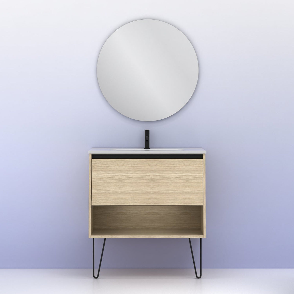 Meuble de salle de bain en bois sur pieds, de coloris chêne clair.