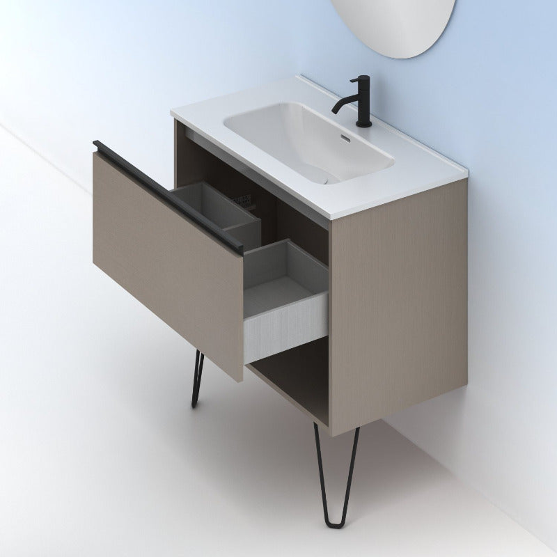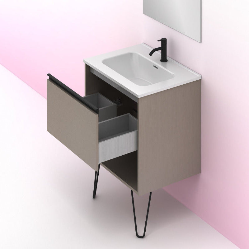 Meuble de salle de bain en bois sur pieds, de coloris marron fumé.