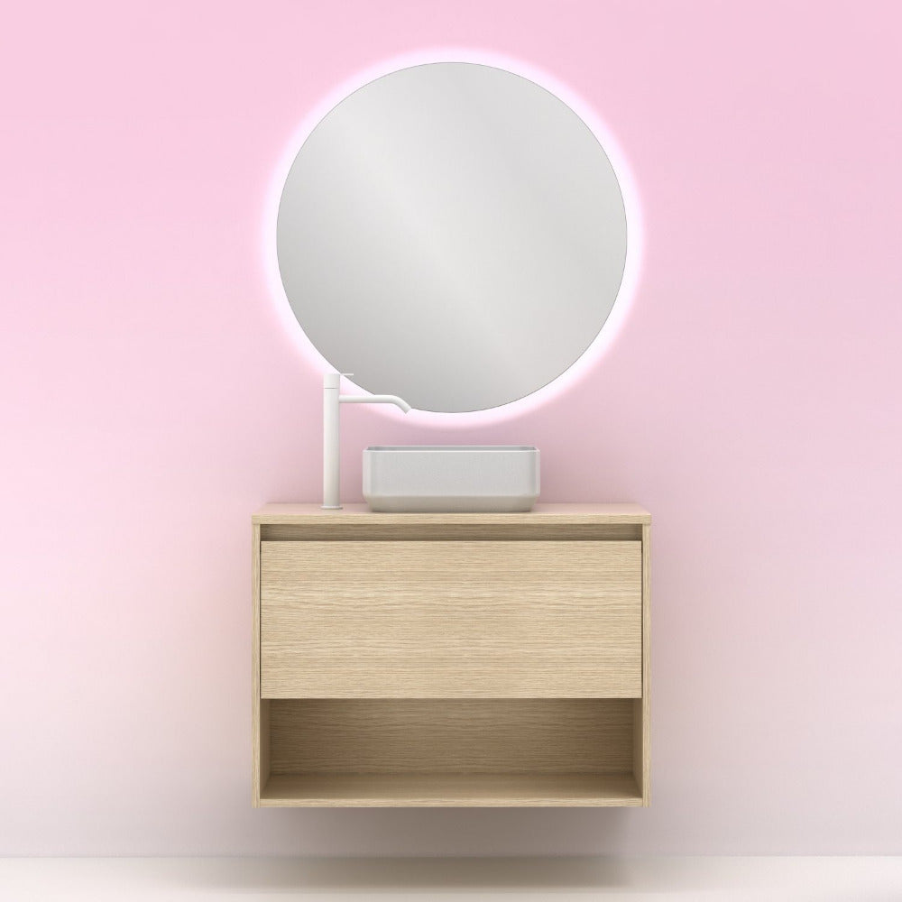- Miroir NOZOMI circulaire avec lumière intégrée, pour le meuble de largeur 80 cm. Il comprend un verre poli circulaire incorporant une bande de LED illuminant l'arrière du miroir. Dimensions : 75 cm de diamètre et 2,5 cm de profondeur.