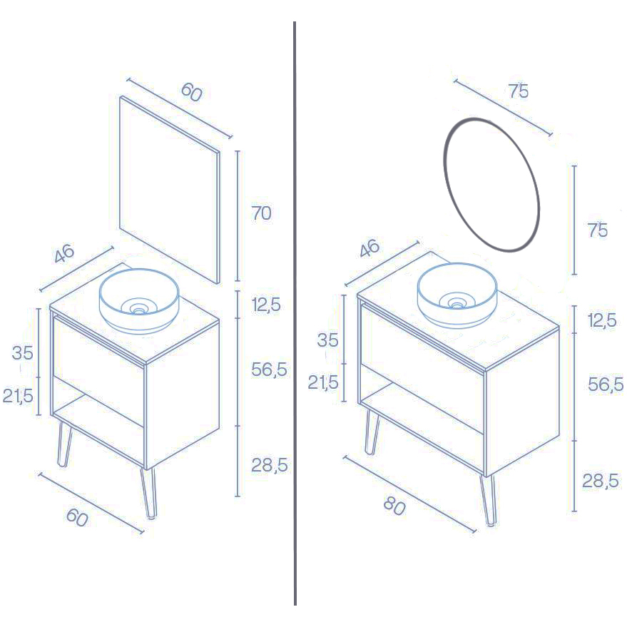 - Miroir MIKU circulaire pour le meuble de largeur 80 cm. Il se distingue par la simplicité de ses lignes design et comprend un verre poli de 4 mm collé sur un panneau de particules aggloméré gris. Dimensions 75 cm de diamètre x 2 cm de profondeur.