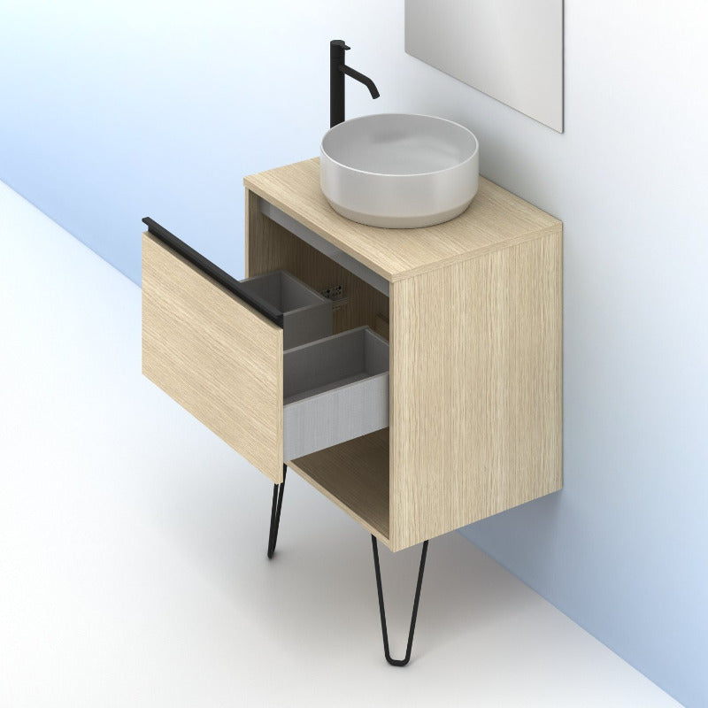 Meuble de salle de bain en bois sur pieds, de coloris chêne clair, vasque posée incluse.