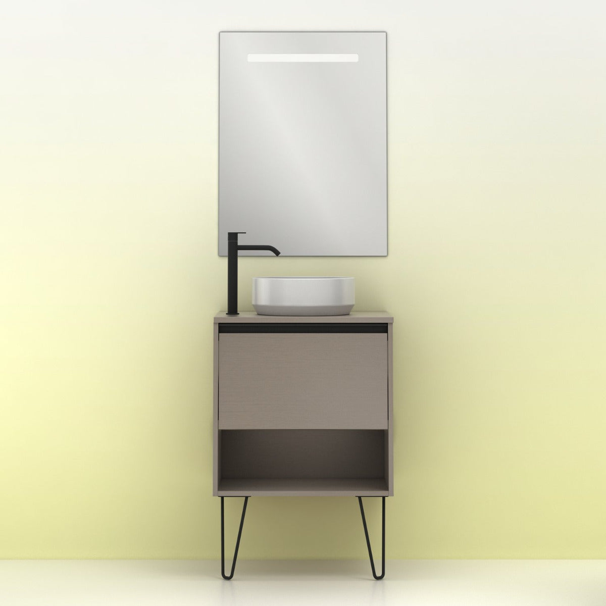 Meuble de salle de bain en bois sur pieds, de coloris marron fumé, vasque posée incluse.