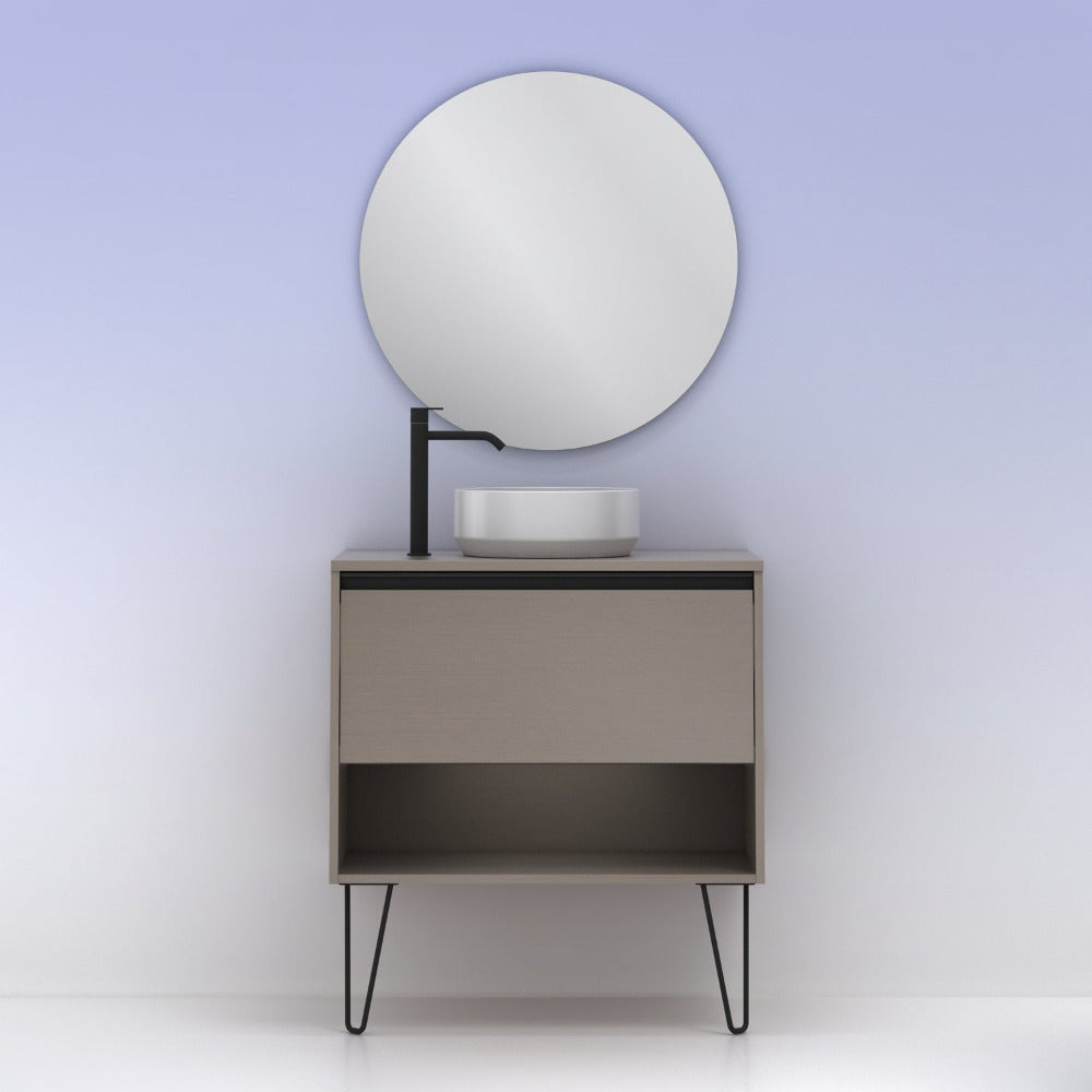 - Miroir MIKU circulaire pour le meuble de largeur 80 cm. Il se distingue par la simplicité de ses lignes design et comprend un verre poli de 4 mm collé sur un panneau de particules aggloméré gris. Dimensions 75 cm de diamètre x 2 cm de profondeur.
