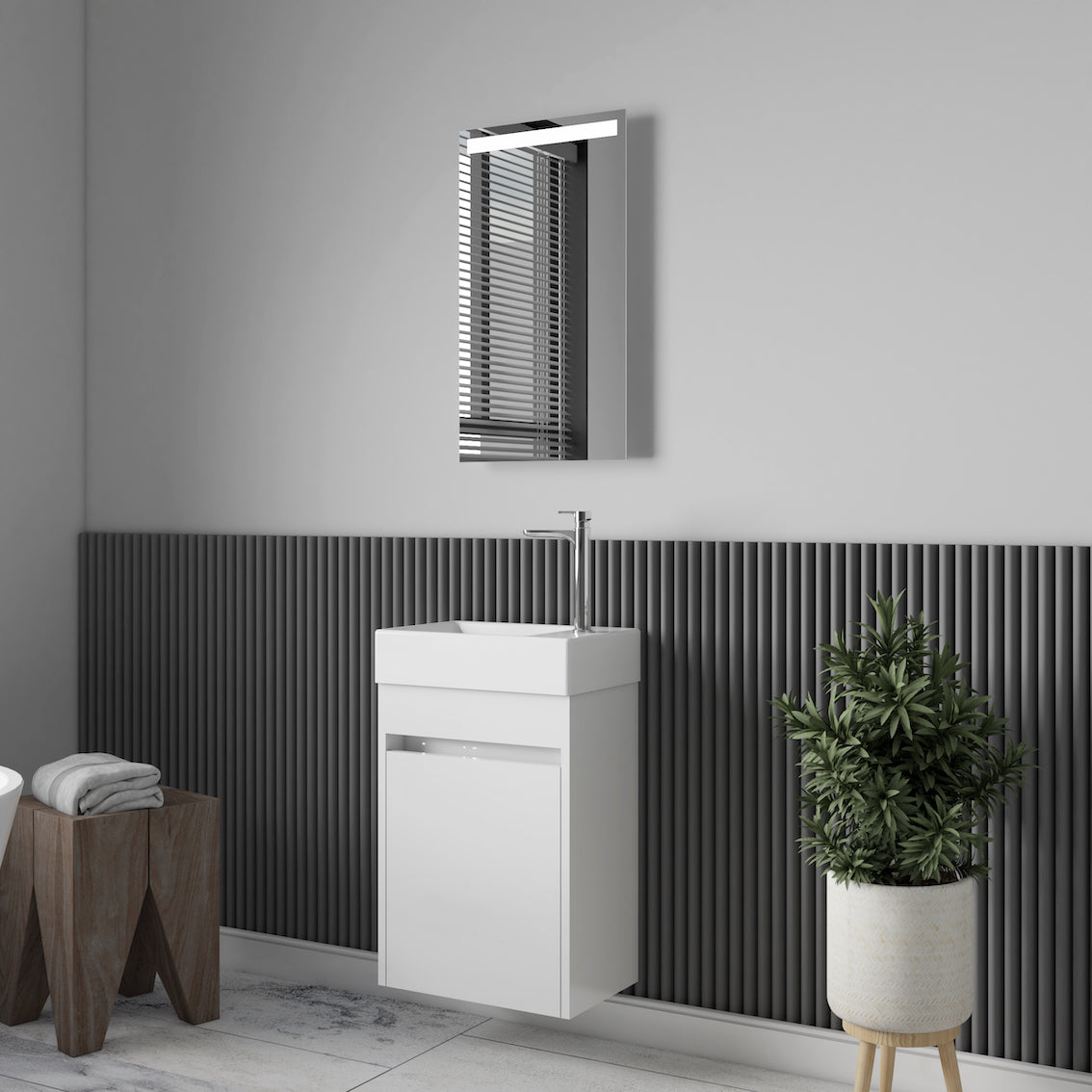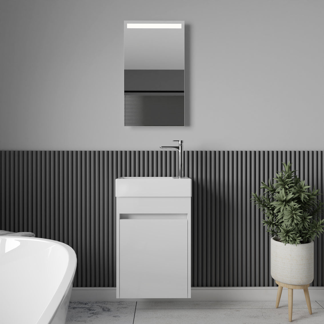Ensemble meuble de salle de bain suspendu au design moderne et minimaliste et aux lignes sobres et épurées.