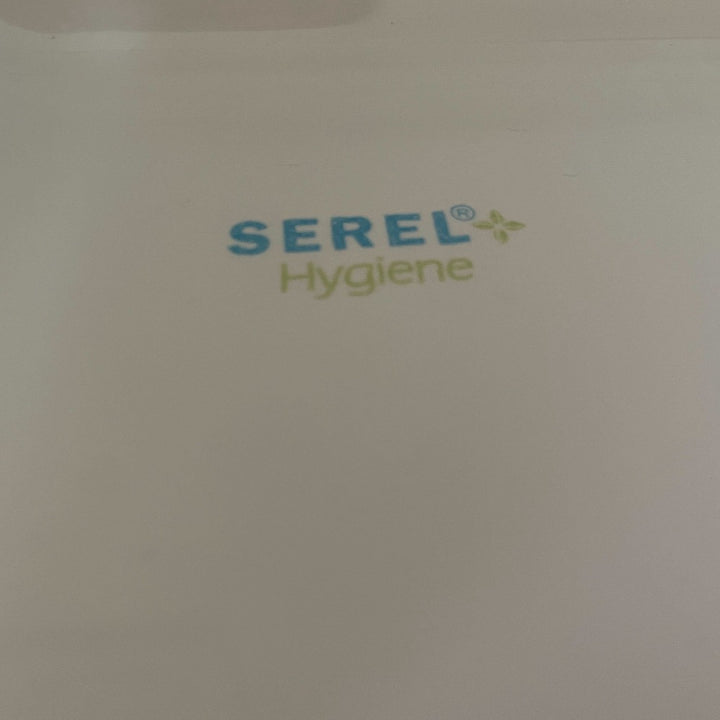 Vasque en céramique de marque SEREL®, sans système de trop-plein, à accompagner d'une bonde sans trop-plein à écoulement libre. Logo imprimé sur le dessus de la vasque.