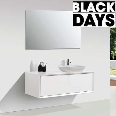 Ensemble meuble de salle de bain suspendu double vasque au design moderne et minimaliste. Meuble en kit à monter soi-même.