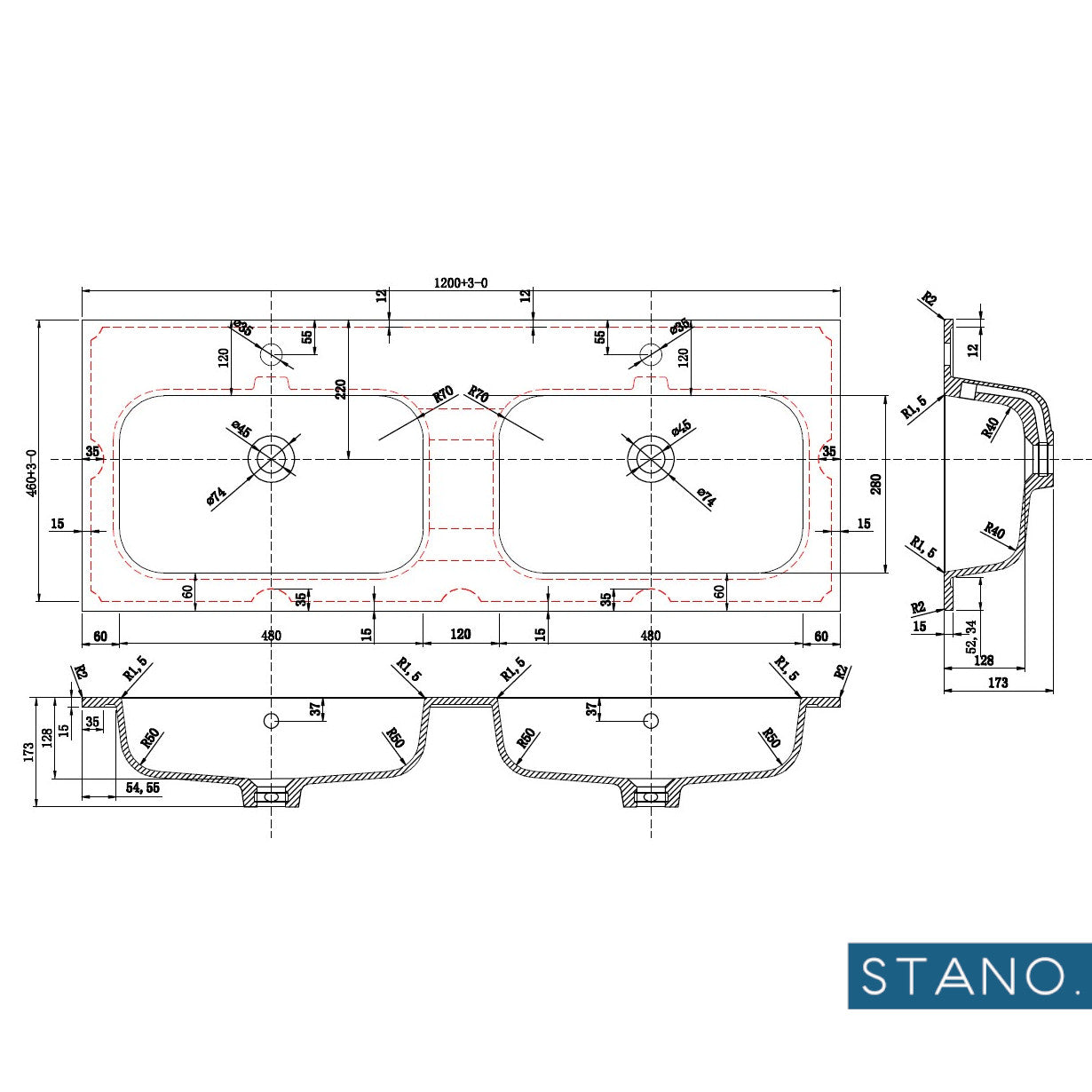 - le plan double-vasque comporte deux trous de robinetterie pré-percés en atelier ;
