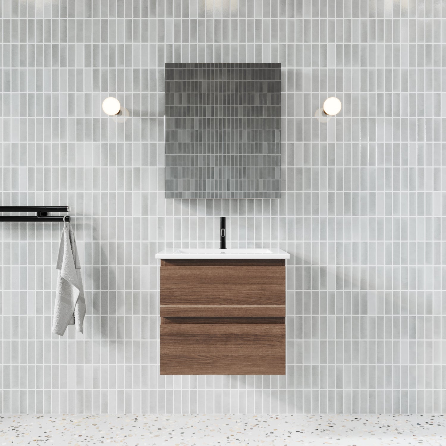 Ensemble meuble de salle de bain suspendu au design moderne et minimaliste et aux lignes sobres et épurées.