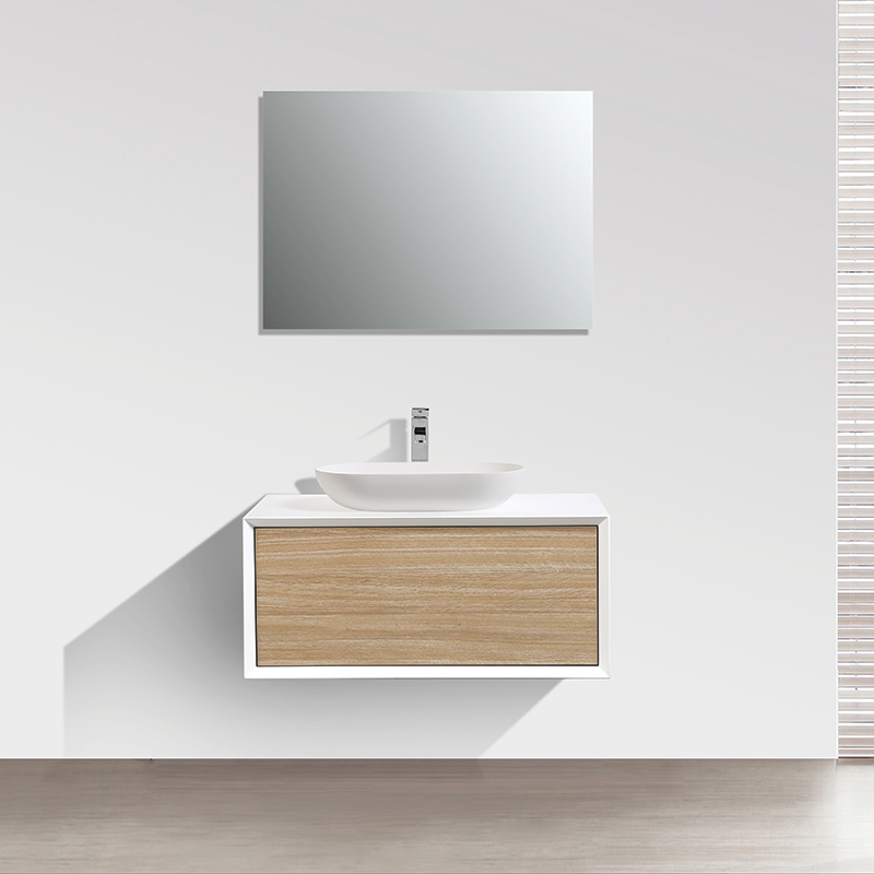 Le meuble PALIO largeur 90 cm offre un espace suffisant pour une vasque à poser. Le plateau supérieur du meuble n'est pas pré-percé, vous laissant ainsi le choix du robinet et de la vasque.