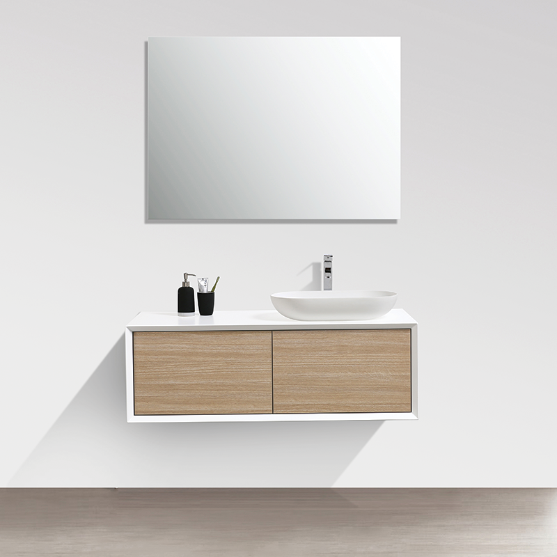 Le meuble PALIO largeur 120 cm offre un espace suffisant pour une ou deux vasques à poser. Le plateau supérieur du meuble n'est pas pré-percé, vous laissant ainsi le choix du robinet et de la vasque.