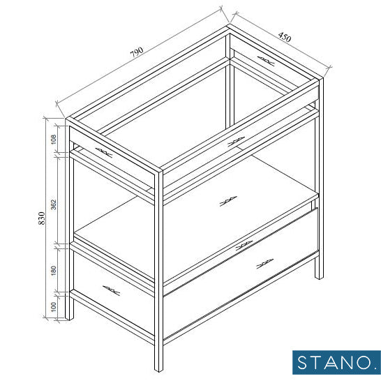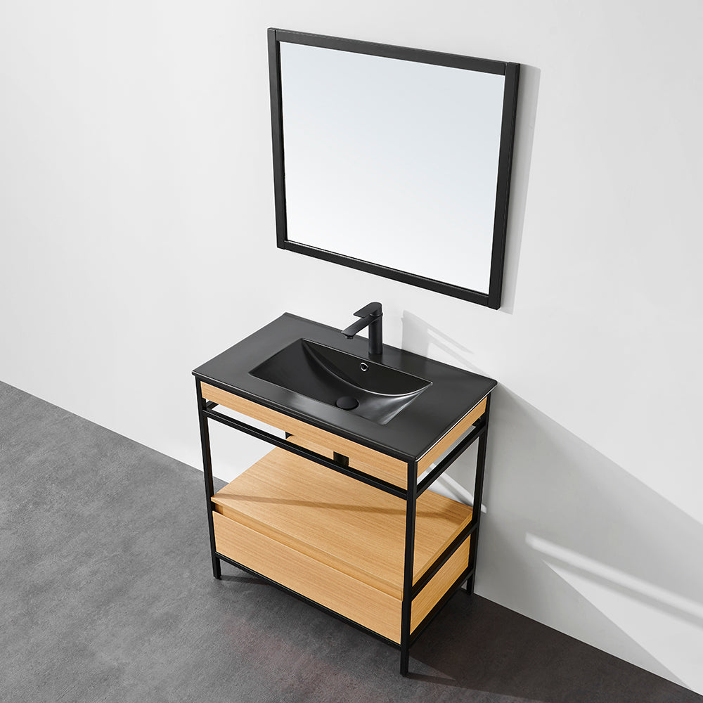 Meuble de salle de bain tendance qui allie les matériaux métal, bois et céramique. Cette combinaison offre solidité, durabilité, et un esthétisme idéal pour apporter une touche moderne et industrielle à votre salle de bain. Longueur vasque 81,5 cm.