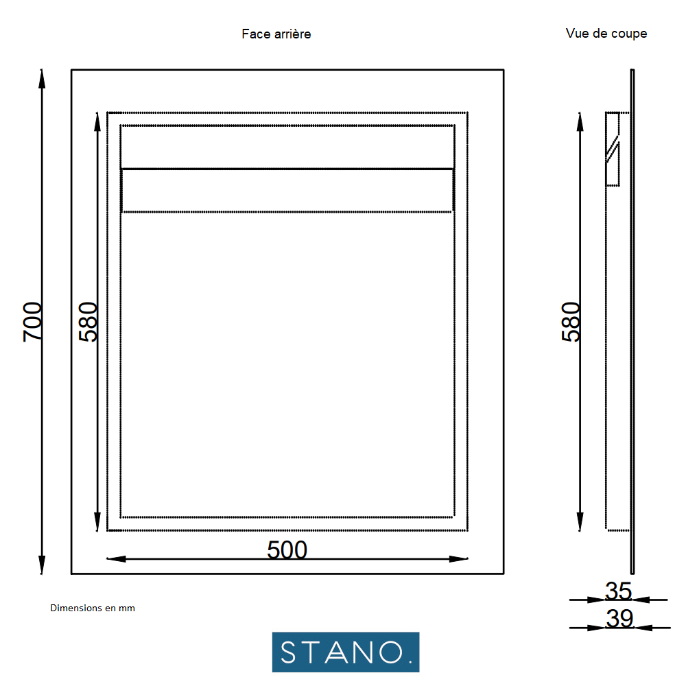 Miroir suspendu au design moderne et minimaliste, aux lignes sobres et épurées, pour salle de bain design. 60 cm de large, 70 cm de haut.