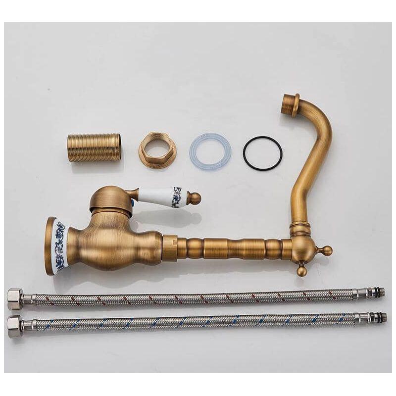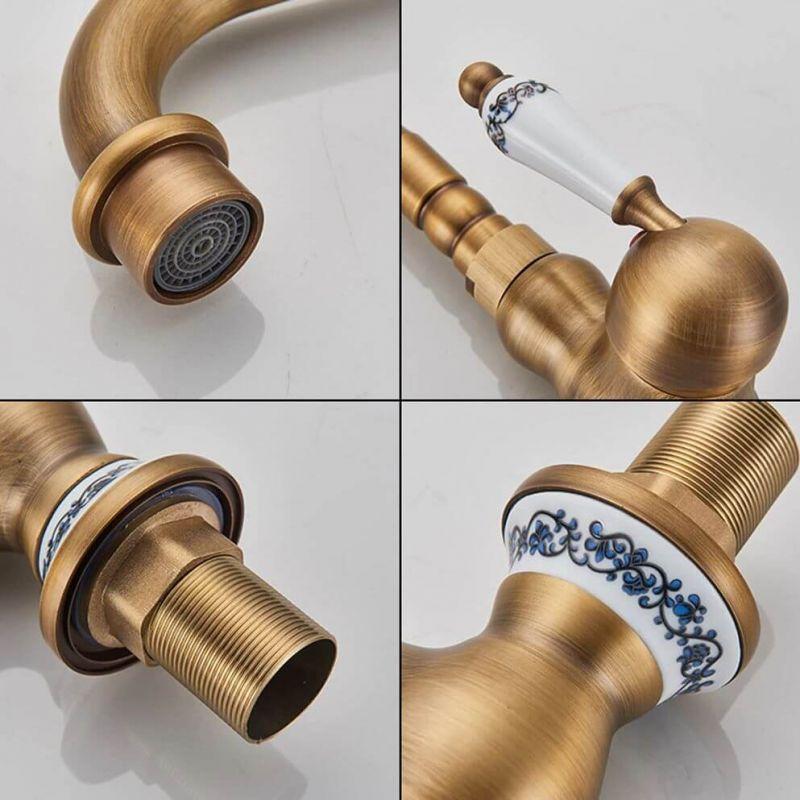 Robinet mitigeur rehaussé pour lavabo ou vasque, finition dorée et bec pivotant, style traditionnel et ancien.
