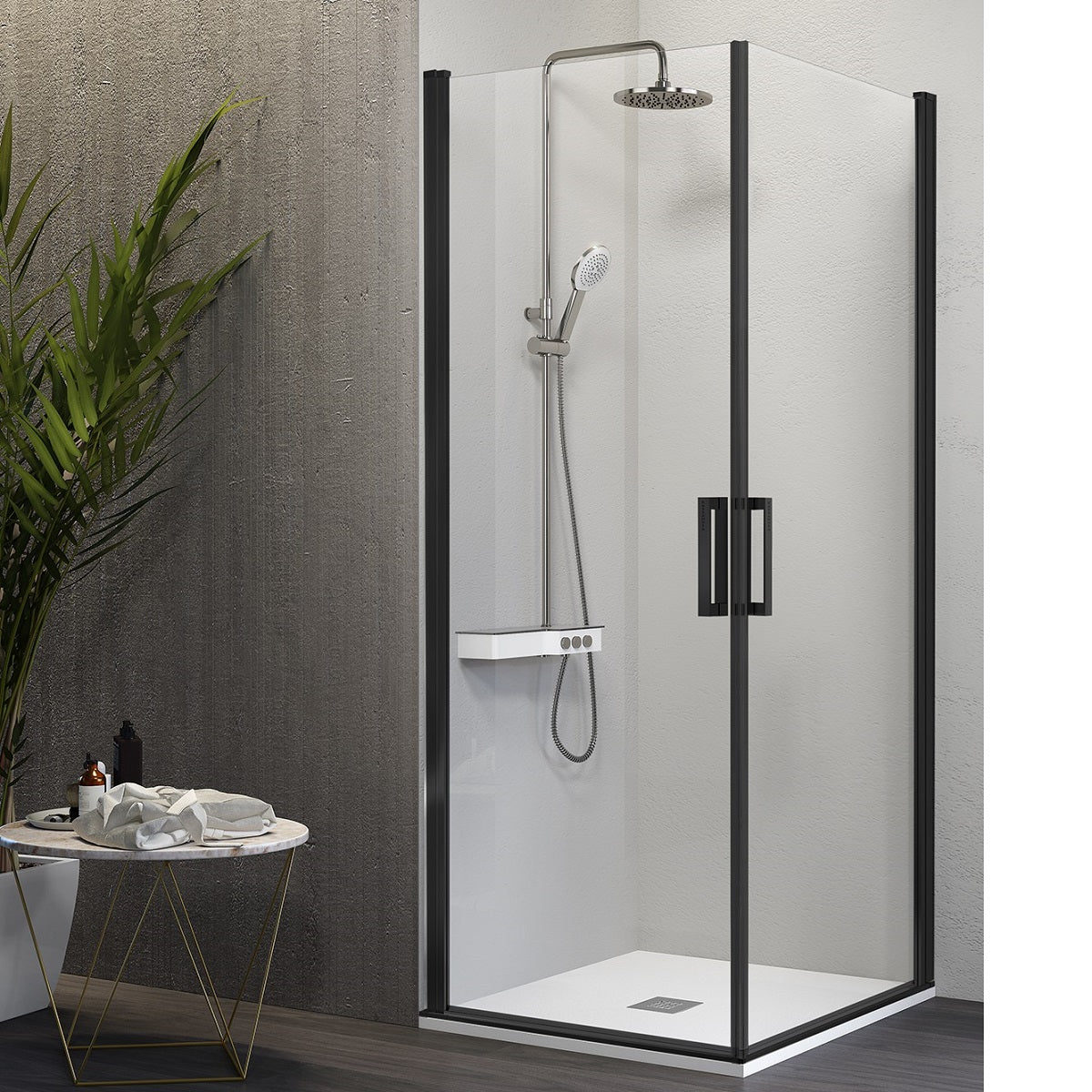 Panneau de douche avec accès en angle comprenant deux portes pivotantes de longueur 54 à 80,5 cm, modèle NARDI, avec profil noir mat.