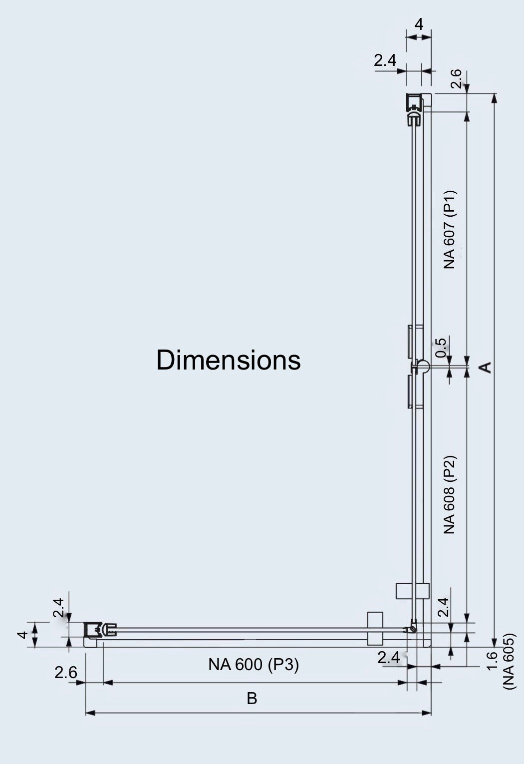 Note explicative : La longueur totale de la paroi peut être modifiée de quelques centimètres en ajustant l'espace à l'intérieur du profil ou la traversée de la porte. Le réglage se fait lors de l'installation et permet d'absorber les petites variations de distances que votre installation peut avoir une fois le receveur de douche installé.