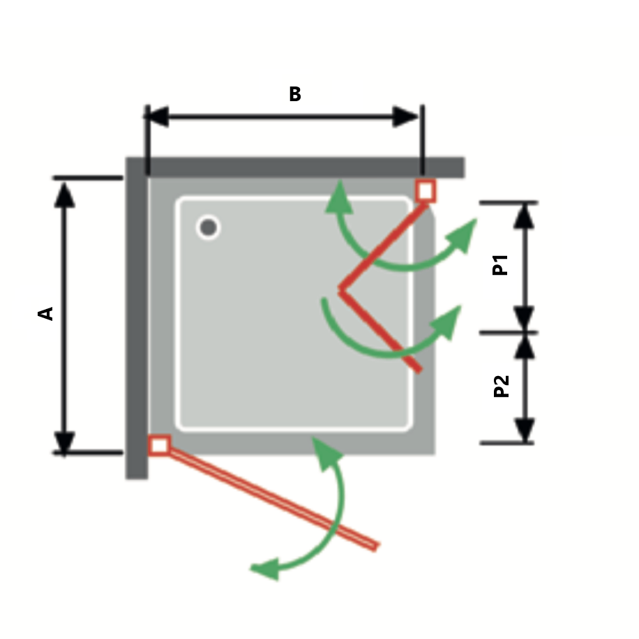 Panneau de douche avec accès en angle comprenant une porte pliante à droite de longueur 64 à 95,5 cm et une porte pivotante de longueur 54 à 80,5 cm, modèle NARDI.