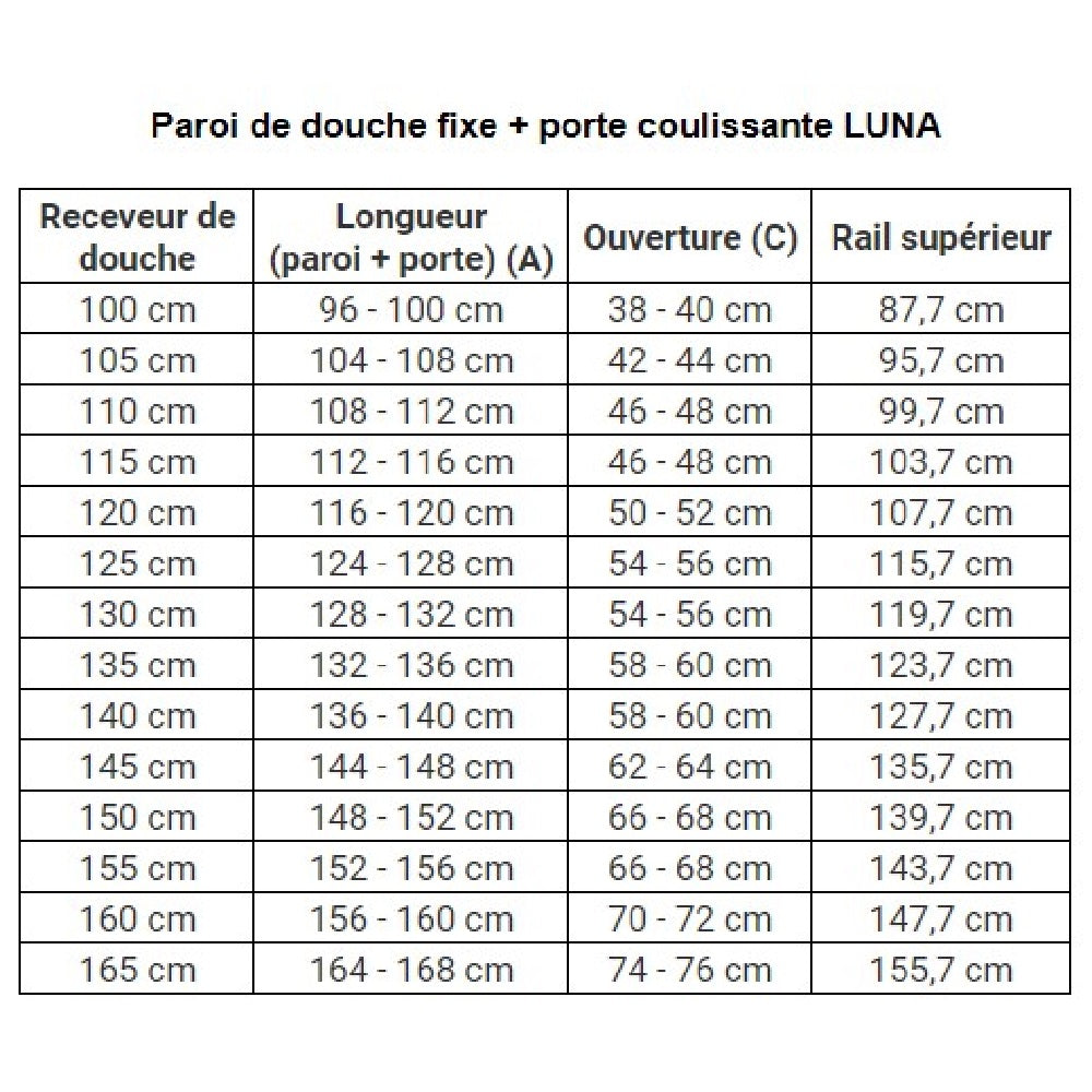 Longueur (paroi + porte) (A) | Ouverture (C) | Rail supérieur |