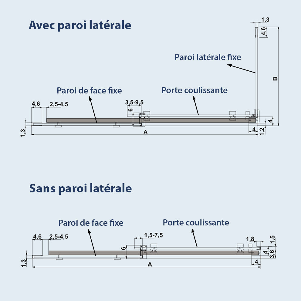 - Longueur (paroi fixe de face + porte) : entre 96 cm et 168 cm