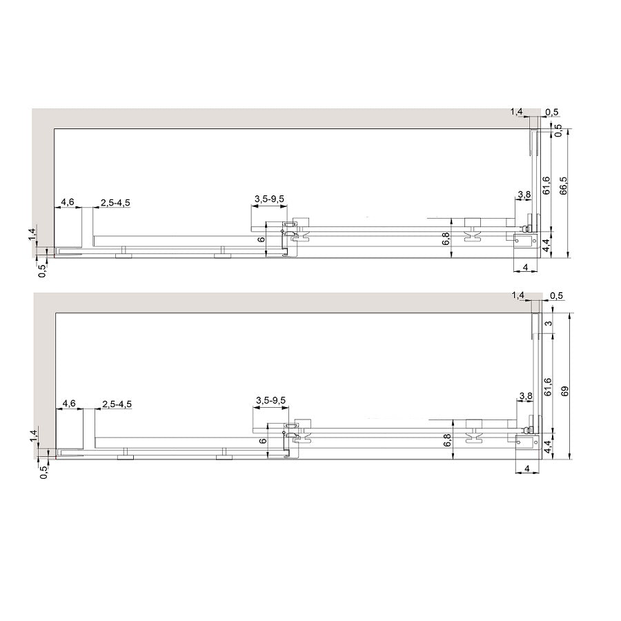 Longueur (paroi + porte) (A) | Ouverture (C) | Rail supérieur |