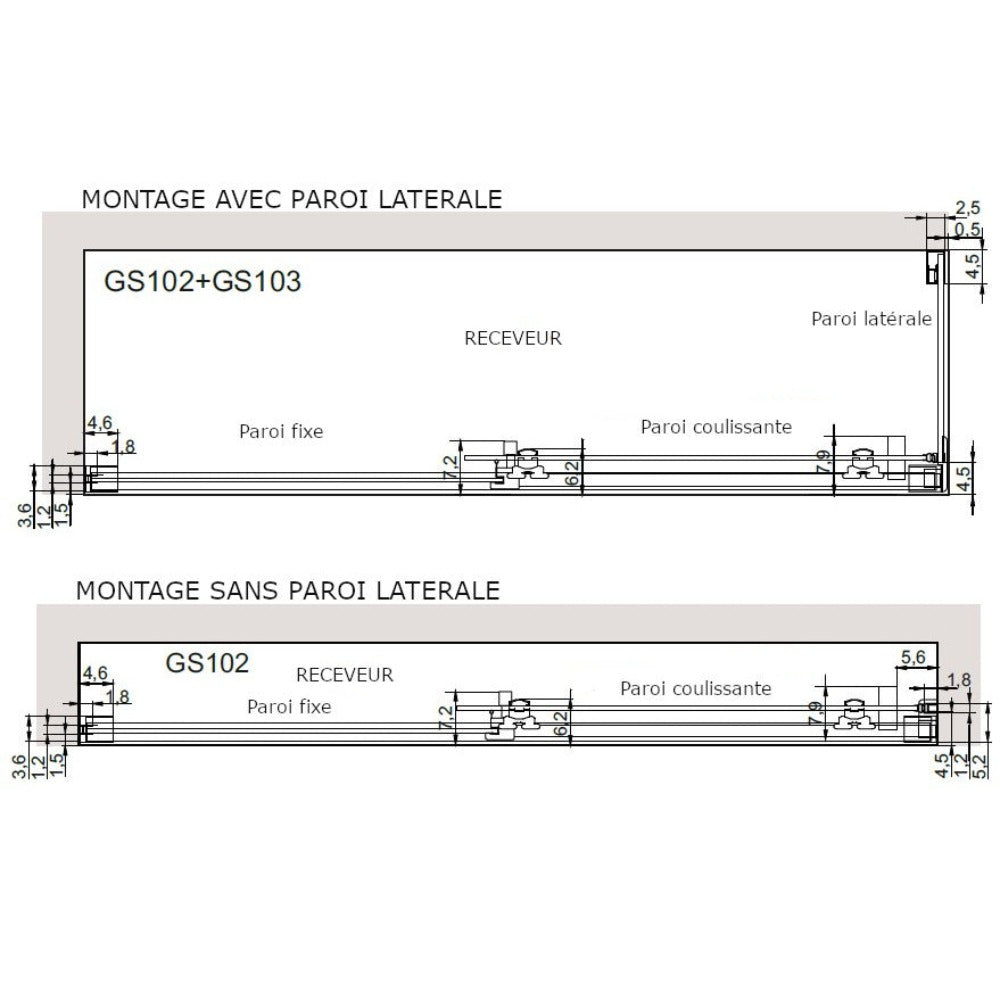 Note : La longueur totale de la paroi peut être modifiée de quelques centimètres en ajustant l'espace à l'intérieur du profil ou la traversée de la porte. Le réglage se fait lors de l'installation et permet d'absorber les petites variations de distances que votre installation peut avoir une fois le receveur de douche installé. Nous indiquons dans ce tableau la dimension disponible pour chaque modèle :